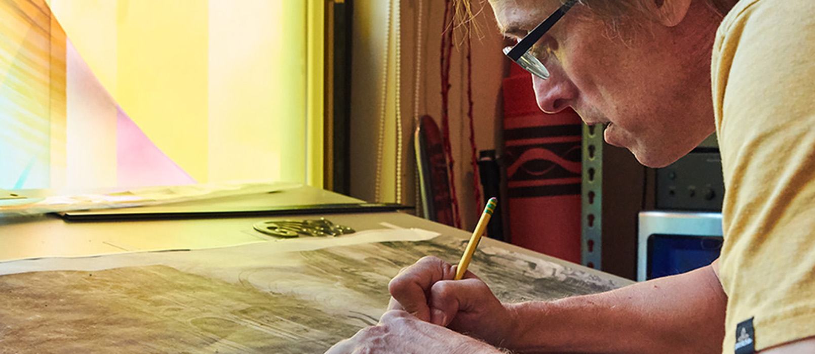 For over forty years I have used Lamberts mouth-blown glass in my architectural art glass commissions. Of course there is an amazing and extensive array of colours and types of glass to chose from but definitely a favourite in their standard line, which I have used extensively, is the 'stormy' opaque white and clear glass. It is a very particular glass with unique qualities that suits my needs in many ways; very adaptable for light control as well as a being great base for a variety of glass treatments. Placing a sheet of Lamberts glass on the table and cutting off the soft edges has almost become a ritual for me.