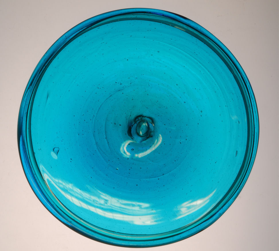 Nach erneutem Einwärmen wird diese mit der Auftreibschere geöffnet. Durch eine spezielle Technik schlägt der Butzenmacher den Rand um, so wird eine bessere Stabilität und Verarbeitbarkeit erreicht. In einer rotierenden Drehbewegung wird dann eine kleine, runde Butzenscheibe geformt. Nach Erreichen der endgültigen Größe wird sie abgeschlagen und im Kühlofen langsam abgekühlt.