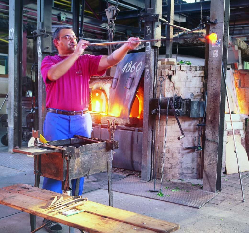 Flüssige Glasmasse wird mit der Butzenpfeife aus dem Ofen entnommen. Die Glasmenge ist dabei maßgebend für die spätere Größe der Butze. Danach wird das Glas zu einer kleinen Kugel aufgeblasen. Deren Umfang ist das zweite wichtige Kriterium für die Größe. Es unterliegt dem Können und der Erfahrung des Meisters, eine gleichmäßige und hochwertige Butze zu schaffen. Die kleine, noch heiße Kugel wird jetzt an ein Hefteisen geklebt und von der Glasmacherpfeife abgeschlagen.
