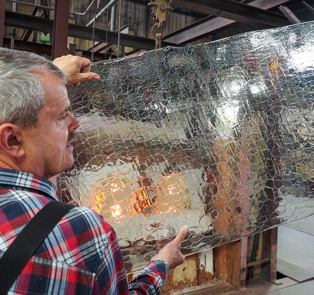 Danach wird das Crackled-Glas abermals erhitzt, um die Oberfläche zu schließen. Die markante Struktur variiert in ihrer Ausprägung. Kleinere, scharfkantige Stellen sind produktionsbedingt.