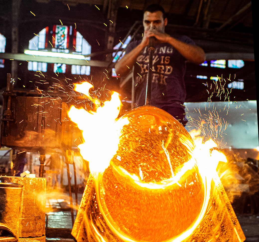 Das Crackled-Glas wird nach dem Blasen des Glasballons in glühendem Zustand kurz in kaltes Wasser getaucht. Durch den Temperaturschock entstehen an der Oberfläche kleinen Risse.