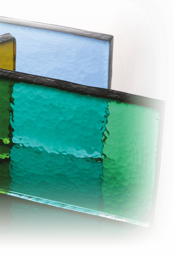 Dallglas ( Dallen, Dalle de verre ) wird in einer Vielzahl an Farben aus Glasgemenge erschmolzen und von Hand in Stahlformen gegossen.