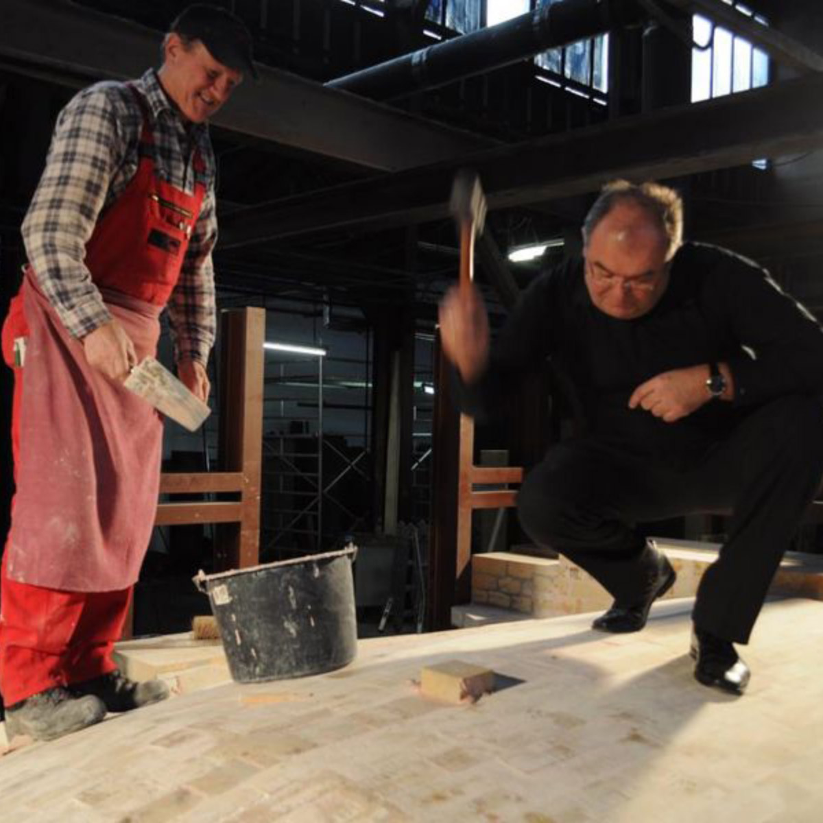 Neubau eines Schmelzofens (Reiner Meindl beim Einschlagen des Gewölbeschlußsteins unseres neu gebauten Schmelzofens.)