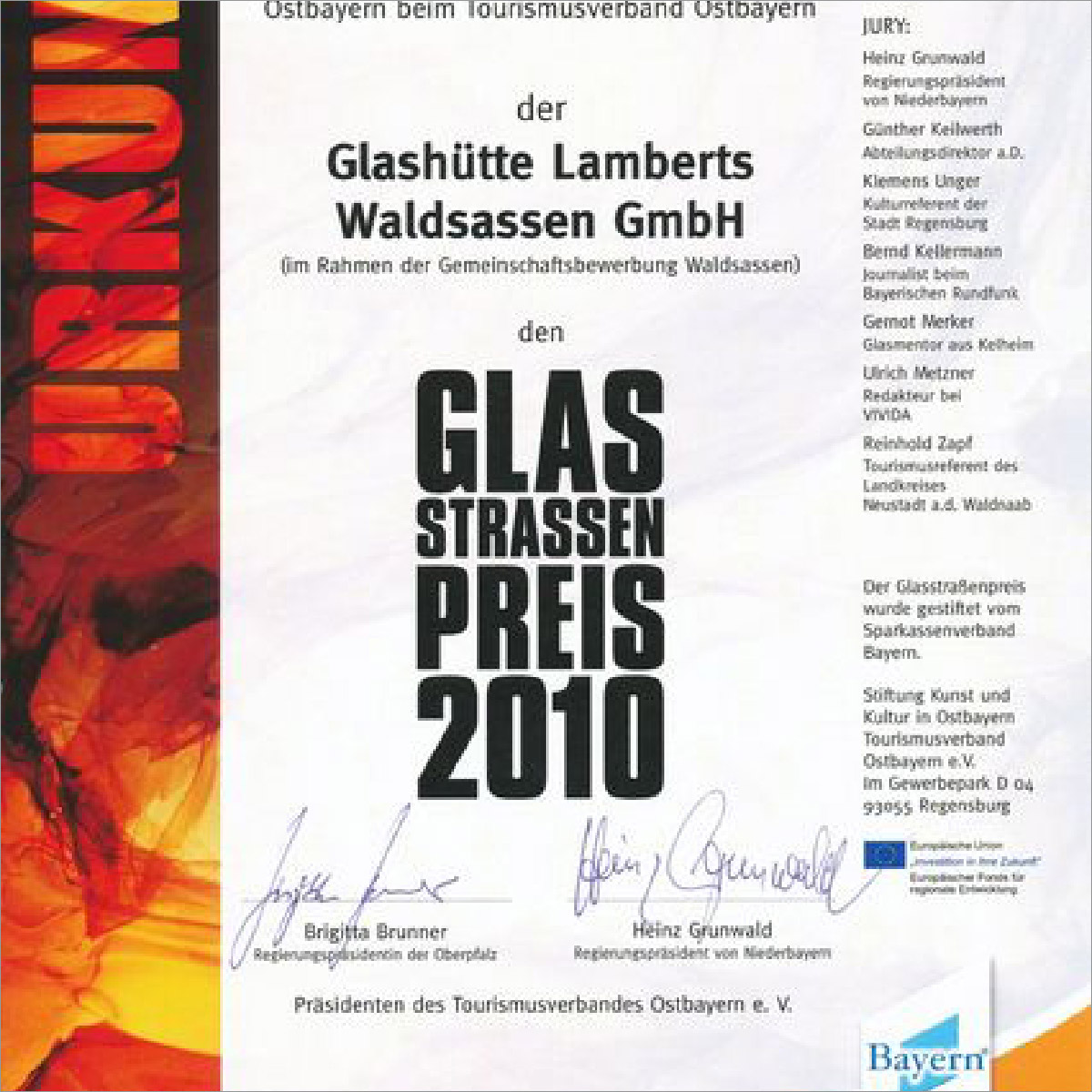 Die Glashütte Lamberts ist ein mittelständischer Familienbetrieb mit 70 Mitarbeitern. In unserer Glasmanufaktur in Waldsassen produzieren wir mundgeblasene und handgefertige Gläser in über 5000 verschiedenen Farben und Strukturen. Original-Lamberts-Gläser sind bei Fachleuten auf der ganzen Welt ein hochgeschätzter Werkstoff.