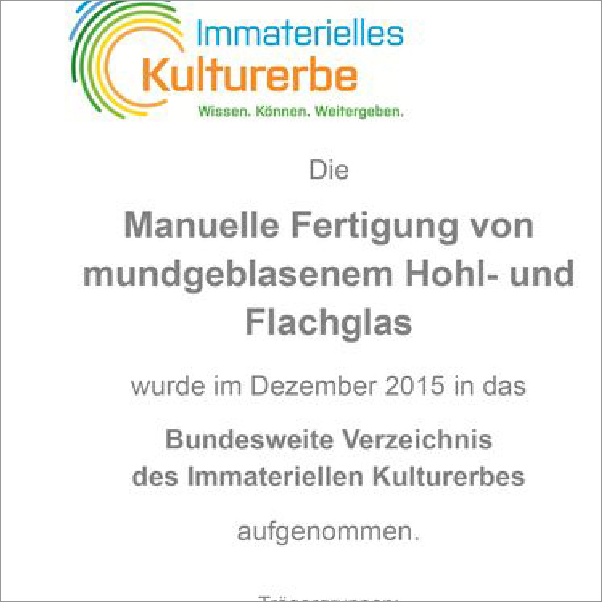 Das Expertenkomitee Immaterielles Kulturerbe bei der Deutschen UNESCO-Kommission hat die „manuelle Glasfertigung“ als Immaterielles Kulturerbe auf nationaler Ebene bewertet. Ein unabhängiges Expertenkomitee folgte der Argumentation der Bewerber, das implizite Wissen der händischen Glasherstellung durch Praxis, Vernetzung, Dokumentation und Weiterentwicklung für die Zukunft zu bewahren. Als Antragsteller freuen wir uns sehr darüber und die Aufnahme in das bundesweite Verzeichnis ist für die gesamte Glas-Community in Deutschland eine große Anerkennung.