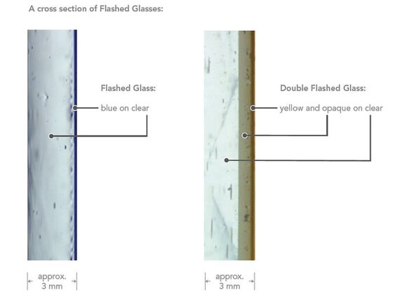 Flashed glasses are always used when brilliant color designs and gradients are to be realized. They consist of 2 or more layers of different colored glass. Exact shading and contours can be created by further processing such as engraving or acid etching.