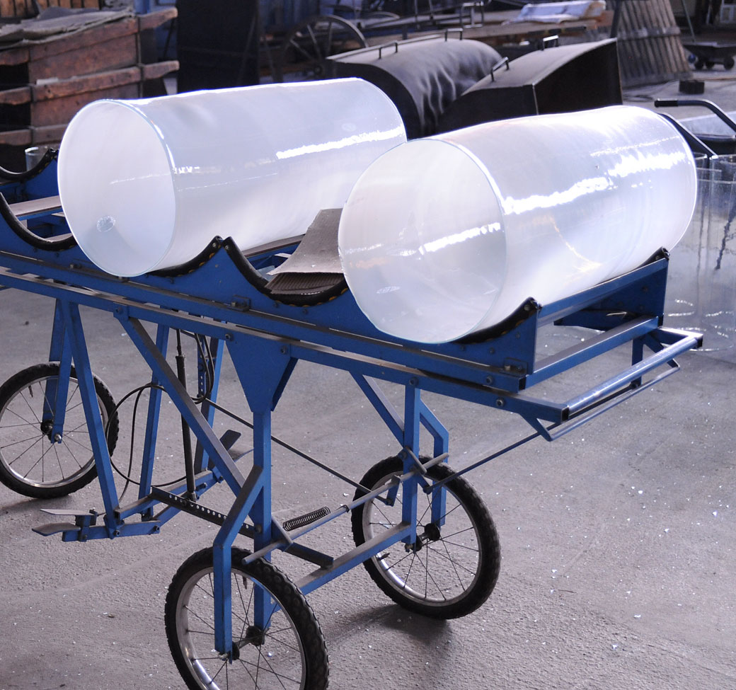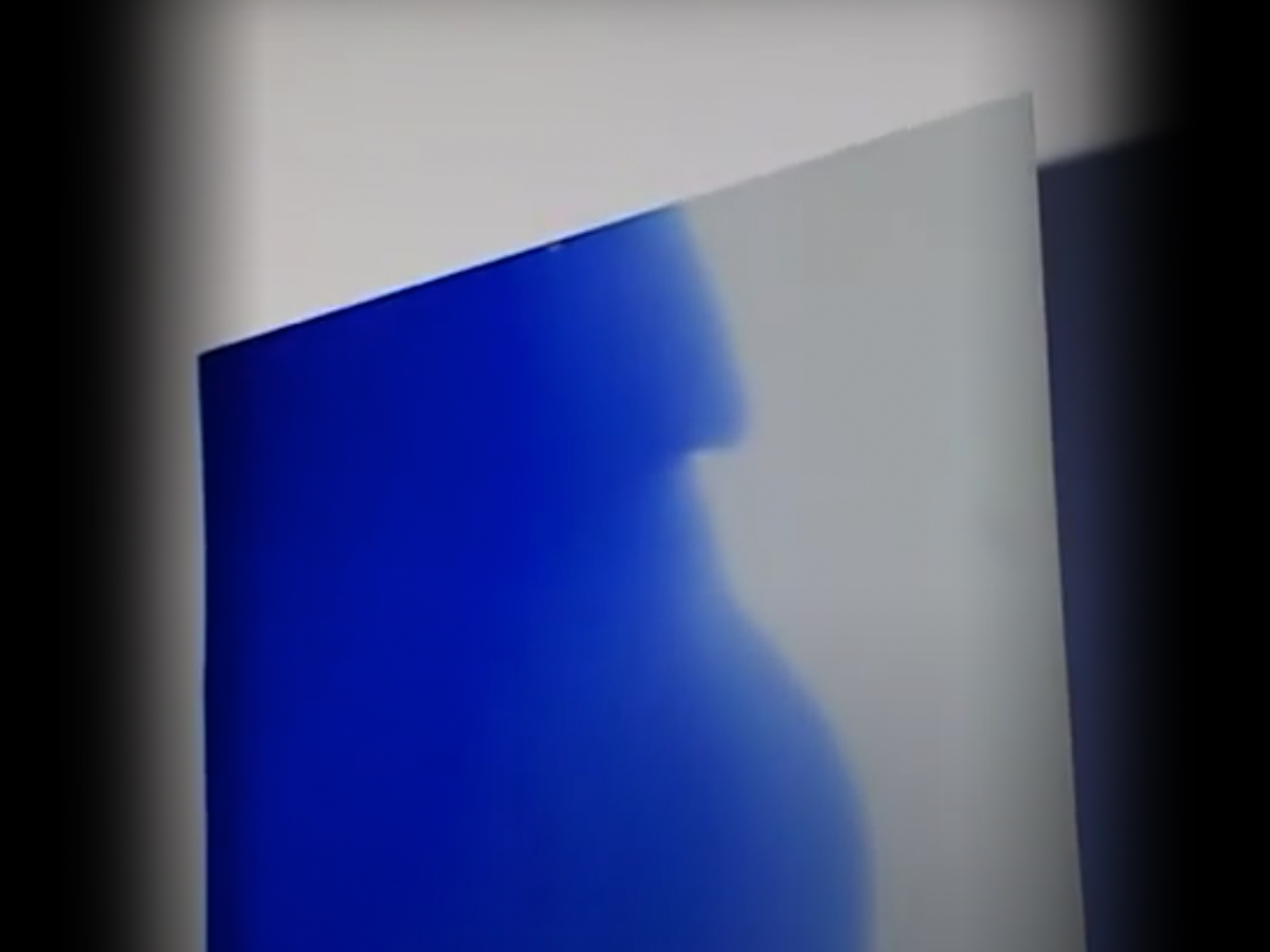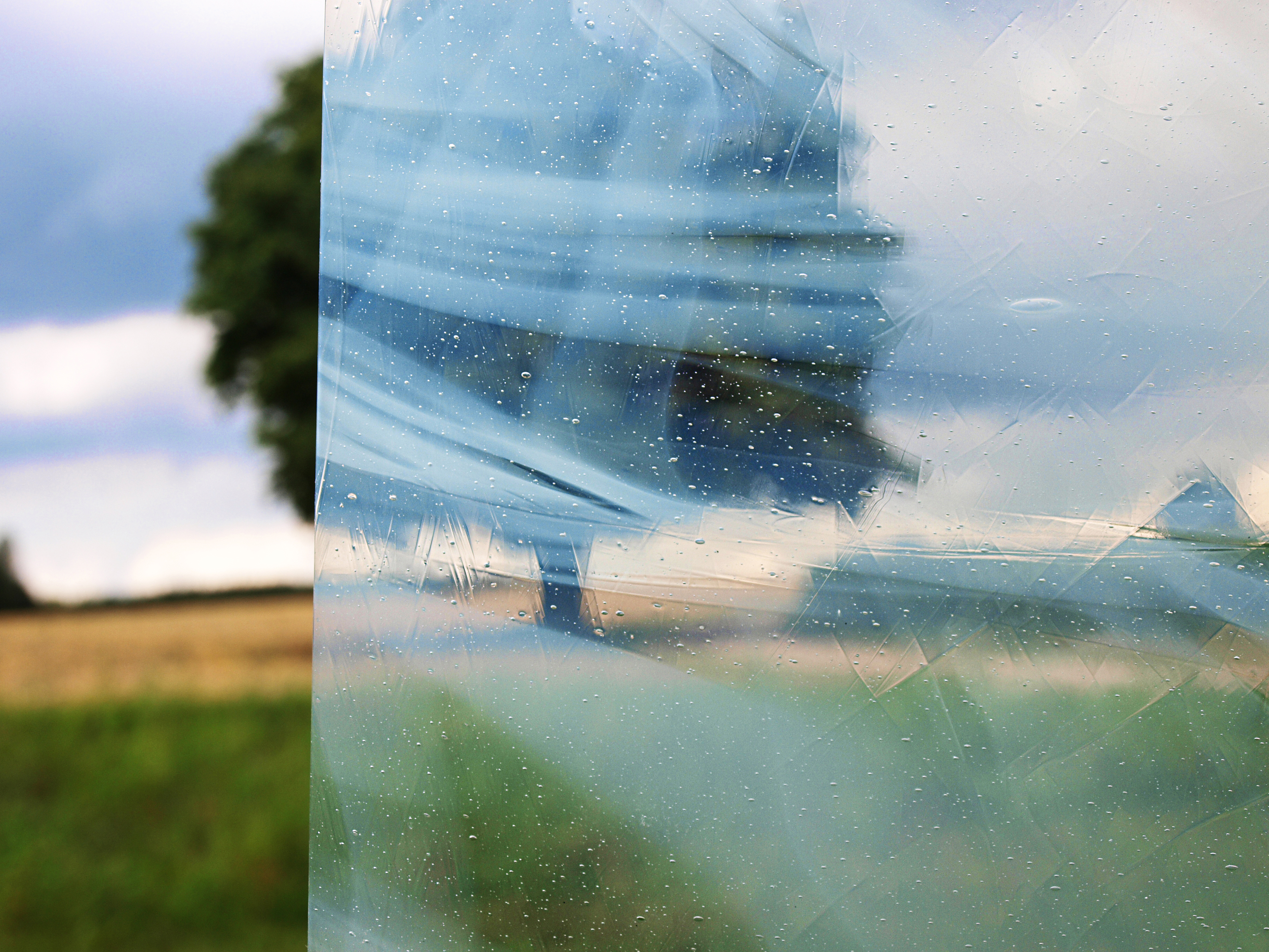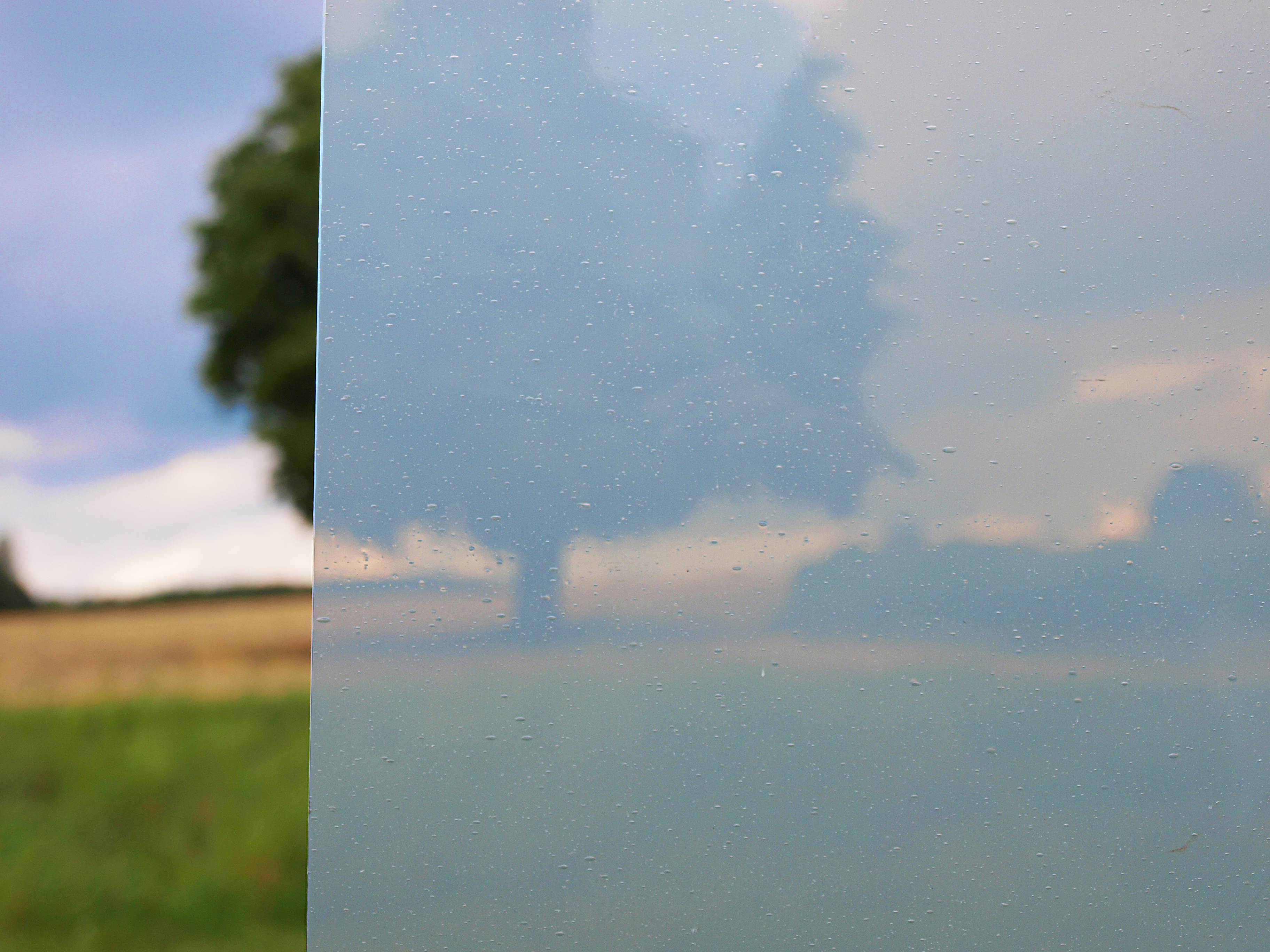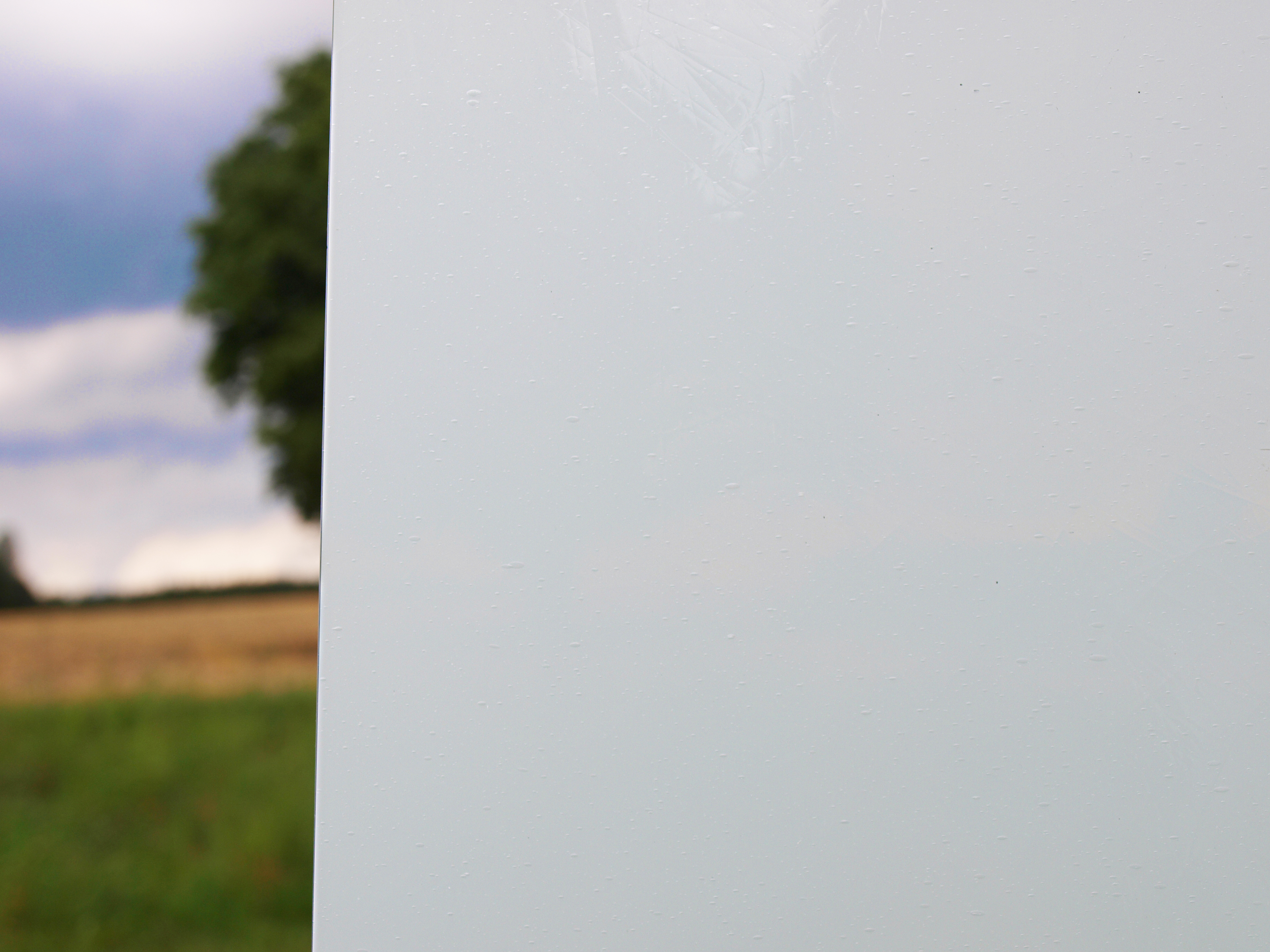 Die Trübung wird durch spezielle Gemengebestandteile hervorgerufen. In Überfangtechnik wird dieses milchige Glas dann in Kombination mit Klar- bzw. Farbglas zu Glastafeln in der Größe von ca. 60x90cm verarbeitet.