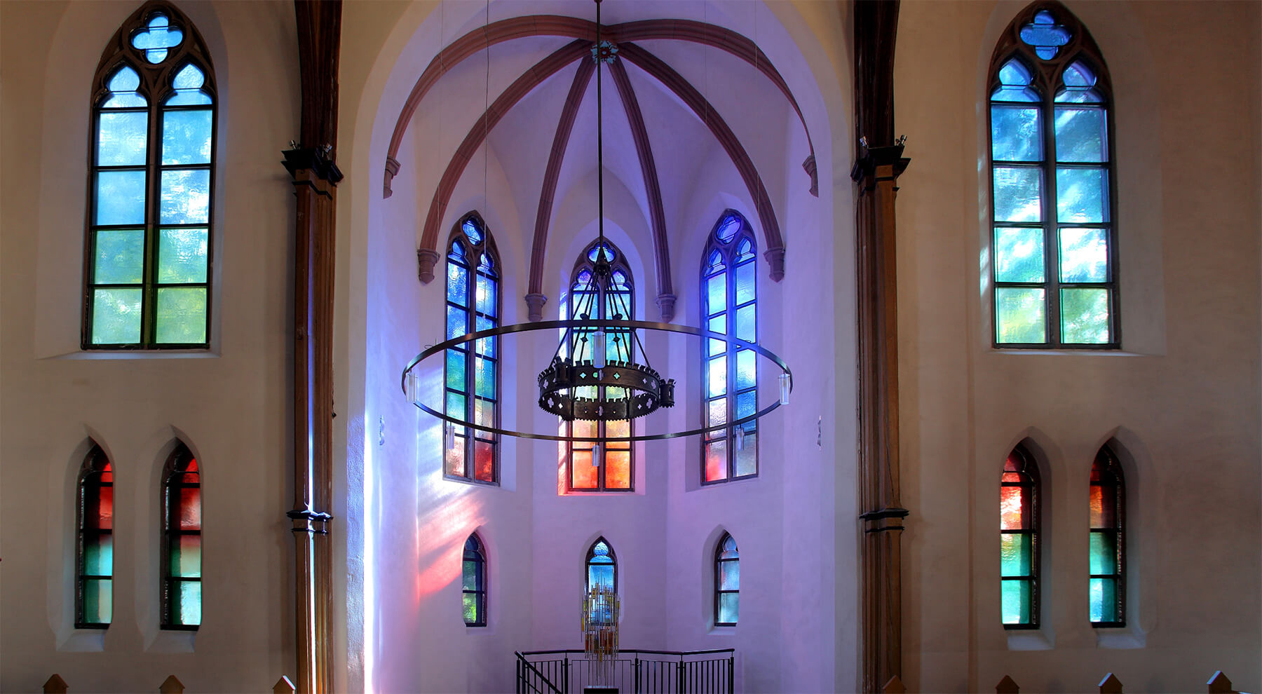 Die aus Zürich stammende Künstlerin Romi Fischer hat eine besondere Gabe, Räume verschiedenster Art so zu gestalten, dass Menschen dadurch berührt, fasziniert und inspiriert werden. Ein weltweit einmaliges Werk ist ihr bei der Gestaltung von 43 Kirchenfenstern in der Evangelischen Kirche in Duisburg-Meiderich gelungen. Die Fenster sind aus jeweils drei bis vier Schichten mundgeblasenem, farbigen LambertsGlas® gefertigt und sind nicht bemalt.