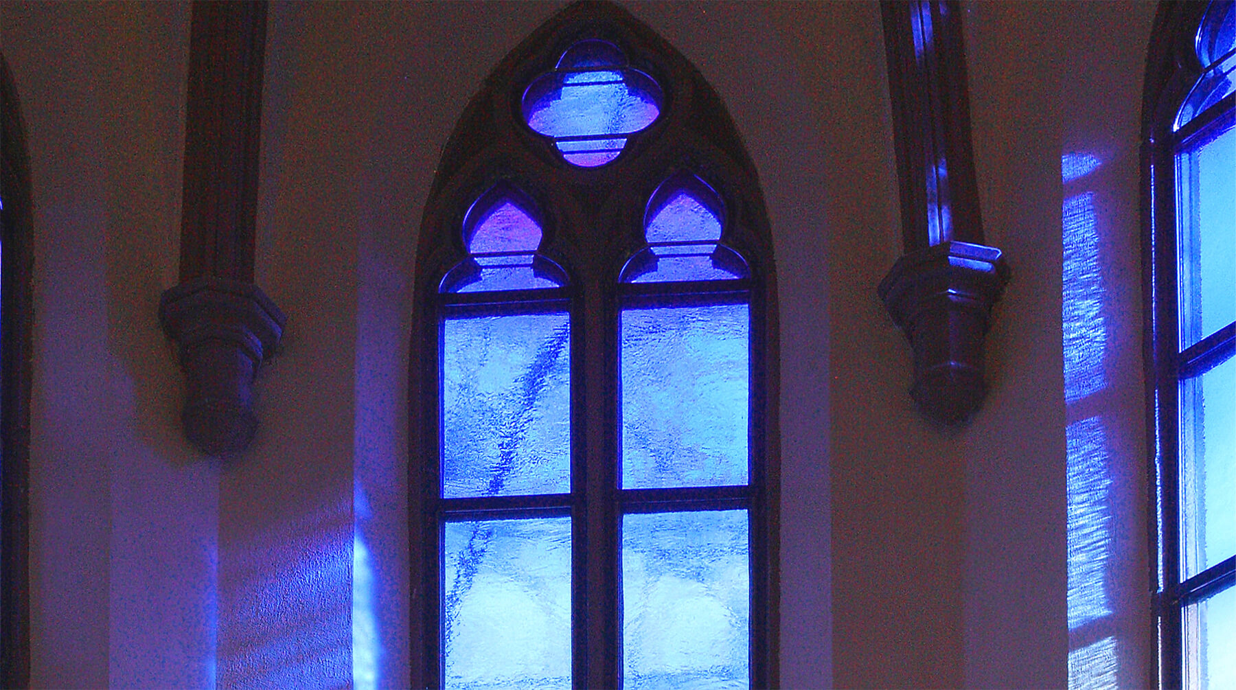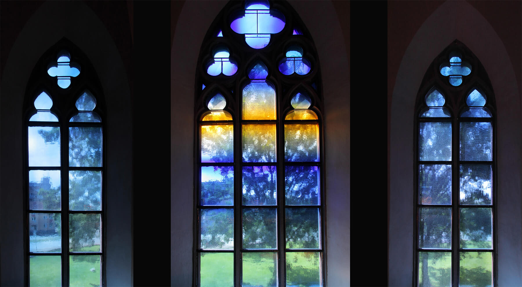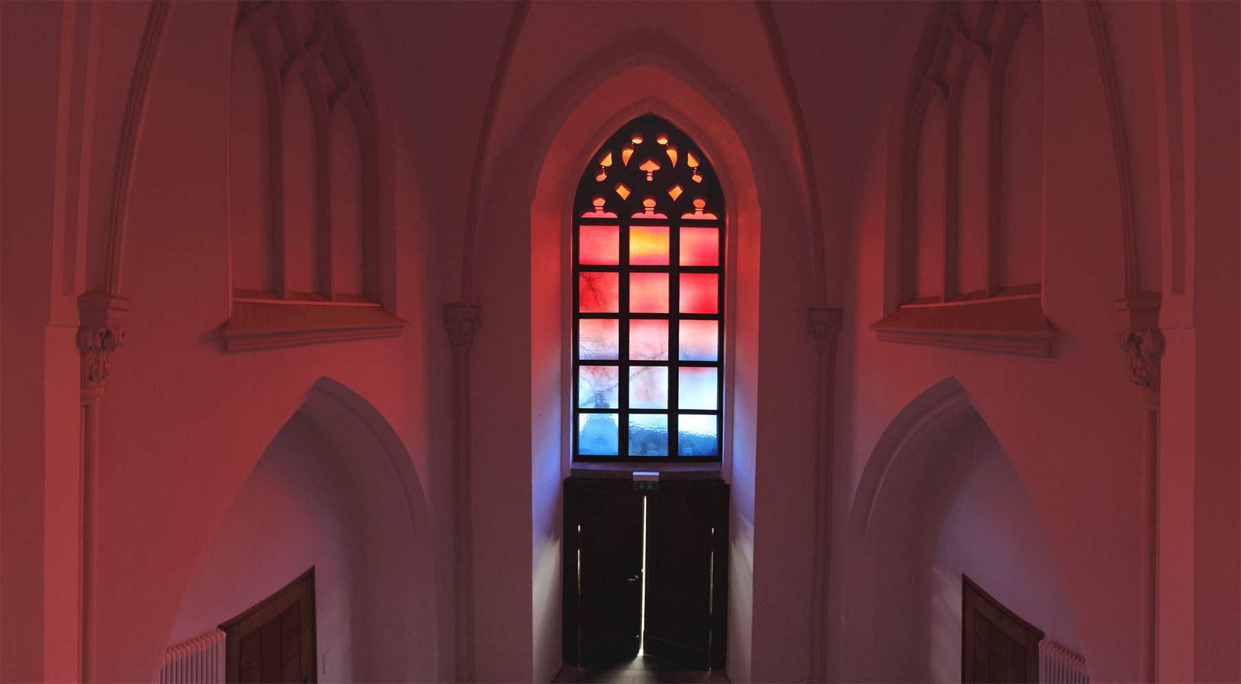 Das rot-blaue Fenster des Morgens im Osten, im Norden und Süden die blauen Fenster des hellen Tages und im Westen das tiefe Abendrot: