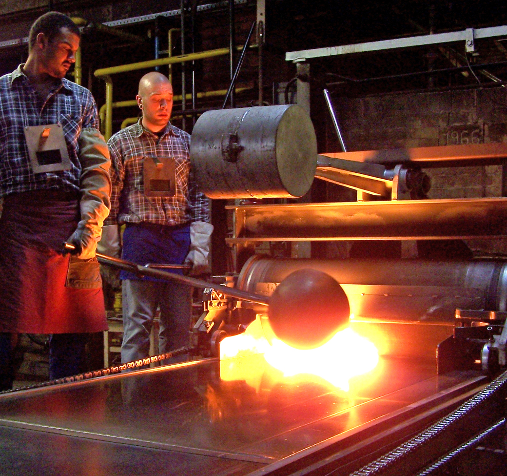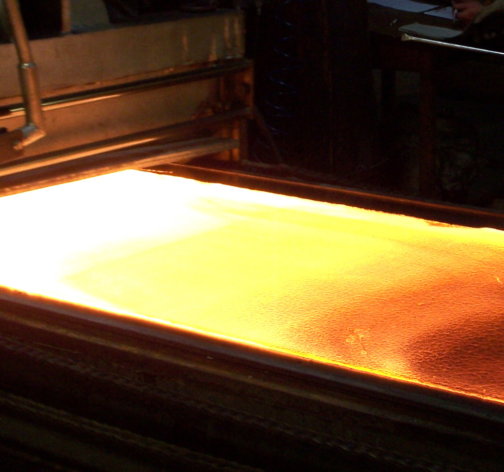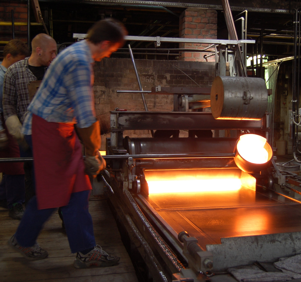 Nach der Entnahme der flüssigen Glasmasse aus dem Schmelzhafen wird diese auf spezielle Stahltische aufgegossen und mit einer Walze ausgewalzt. Dabei sind weder Tisch noch Walze strukturgebend.